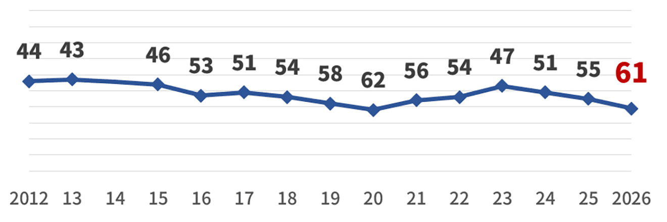 当初の40位台から低下傾向が続き、2020年には62位まで下がりました。2023年には47位まで回復しましたが、その後再び下落を続けています(下図ご参照)。